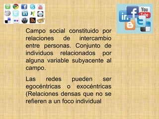 Este documento describe las redes sociales. Define una red social como un campo constituido por relaciones de intercambio entre personas relacionadas por alguna variable subyacente. Explica que las redes pueden ser egocéntricas u horizontales y que existen redes verticales más especializadas en diferentes temas como música, fotos o viajes. Finalmente, señala que las redes están conformadas por instituciones formales e informales y que las redes verticales determinan la jerarquía mientras las horizontales garantizan la supervivencia de los sectores formales e inform