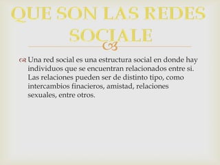 Una red social es una estructura social donde individuos se relacionan entre sí de diferentes formas como amistad o intercambios financieros. Se usan para interacción entre personas a través de chats, juegos en línea u otros medios. Algunas de las primeras redes sociales incluyen Classmates.com en 1995 y sitios que promovían círculos de amigos en línea en 2002.
