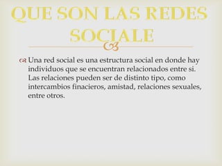 Este documento describe la evolución histórica de las redes sociales desde su origen en 1995 hasta la actualidad. Explica cómo sitios como Classmates, MySpace y Facebook permitieron a las personas mantener el contacto con amigos y conocidos. También describe plataformas como Twitter, YouTube y MSN Messenger que revolucionaron la forma en que las personas se comunican y comparten contenido en línea.