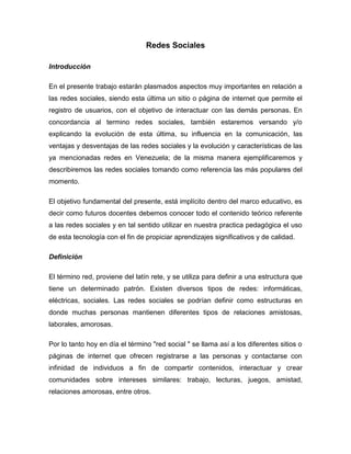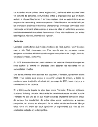 Este documento resume las redes sociales, definiéndolas como sitios web que permiten a los usuarios registrarse e interactuar. Explica la evolución de las redes sociales desde su inicio en 1995 hasta las más populares de la actualidad como Facebook y Twitter. También describe los impactos de las redes sociales en la comunicación, así como las ventajas de mantener contacto y compartir información y las desventajas relacionadas a la privacidad y adicción.