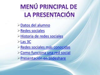 Este documento resume las redes sociales, incluyendo su historia, las más conocidas como Facebook y Twitter, y cómo funcionan. Explica que las redes sociales son estructuras sociales compuestas de grupos conectados a través de relaciones como amistad o intereses. Luego resume brevemente la historia de las redes sociales desde el correo electrónico en 1971 hasta el crecimiento de Facebook y Twitter en la actualidad. También cubre conceptos clave como las 3C y cómo crear un perfil y conectarse con otros en una red social típica.