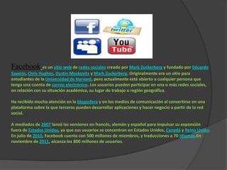 Las redes sociales son estructuras sociales compuestas de grupos de personas conectadas por relaciones como amistad o intereses comunes. El análisis de redes sociales estudia esta estructura aplicando teoría de grafos e identificando nodos y enlaces. Redes sociales operan a niveles desde relaciones familiares hasta políticas y juegan un papel crítico en agendas políticas.