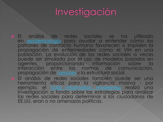 El análisis de redes sociales se ha utilizado en epidemiología para entender cómo los patrones de contacto humano afectan la propagación de enfermedades como el VIH, y a veces la evolución de redes sociales puede simularse con modelos basados en agentes. También puede usarse para vigilancia masiva, como analizar redes sociales para determinar si ciudadanos representan amenazas. El análisis de redes sociales se ha convertido en una metodología clave en ciencias sociales como sociología, antropología y psicología social