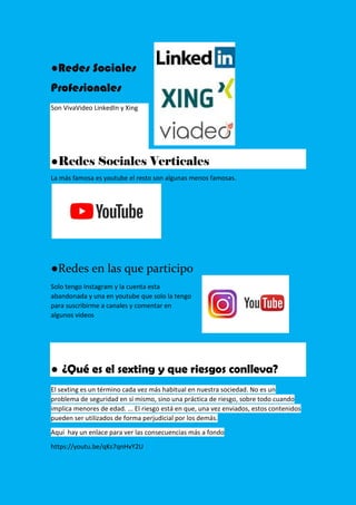Las redes sociales son páginas web donde los usuarios comparten información personal y contenido multimedia para crear una comunidad virtual e interactiva. Las primeras redes sociales surgieron en 1995 y las más populares actualmente son Facebook, Instagram, Twitter y YouTube. Algunas redes se enfocan en conectar profesionales como LinkedIn y Xing, mientras que otras agrupan contenido por temas como YouTube. El sexting, el envío de contenido sexual entre menores, conlleva riesgos ya que estos materiales pueden ser usados de forma perjudicial una vez compart