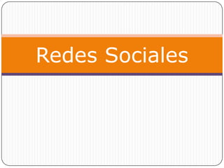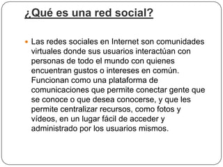 Este documento describe las redes sociales, incluyendo que son comunidades virtuales donde las personas interactúan con otros que comparten intereses, que las más populares son Facebook, Twitter y YouTube, y que ofrecen tanto ventajas como contactar con conocidos y compartir momentos, como desventajas como exponer información privada y ser adictivas. También discute cómo configurar la privacidad y seguridad en las redes sociales.