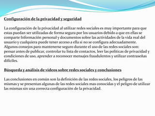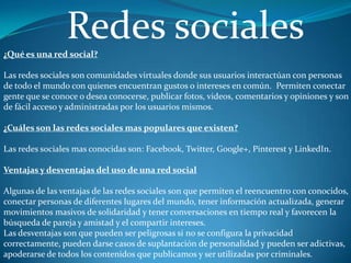 Las redes sociales permiten a los usuarios conectarse con personas de todo el mundo con intereses similares, publicar contenido y mantenerse actualizados. Las redes sociales más populares son Facebook, Twitter, Google+, Pinterest y LinkedIn. Si bien las redes sociales facilitan la comunicación y el compartir de contenido, también plantean riesgos como la falta de privacidad y la suplantación de identidad si no se configuran adecuadamente.