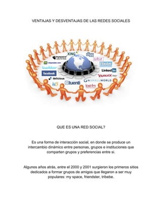 Este documento resume las ventajas y desventajas de las redes sociales. Entre las ventajas se encuentran la posibilidad de reencontrarse con conocidos, integrarse a reuniones en línea, establecer nuevos contactos afectivos y compartir momentos especiales con personas cercanas. Algunas desventajas son que pueden exponer la vida privada si no se configura correctamente la privacidad, dar lugar a suplantación de identidad y ser adictivas al consumir mucho tiempo.