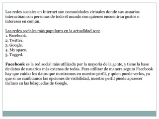 Las redes sociales permiten a los usuarios interactuar con personas de todo el mundo con intereses similares. Las redes sociales más populares son Facebook, Twitter, Google, MySpace y Tagged. Facebook es la red más utilizada, con la base de datos de usuarios más grande. Las ventajas de las redes sociales incluyen mantenerse en contacto con amigos, compartir información y acceder a noticias y entretenimiento. Las desventajas son el mal uso de la privacidad de los usuarios, exponer demasiada información personal y problemas con la actualización de la información compartida