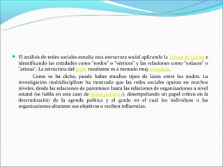 El documento habla sobre las redes sociales. Define las redes sociales como estructuras sociales que se pueden representar como grafos donde los nodos son individuos y las aristas son las relaciones entre ellos. Describe varias redes sociales populares como Facebook, Tuenti y Twitter. También discute las ventajas e inconvenientes de las redes sociales.