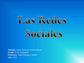 Este documento presenta información sobre las redes sociales. Define redes sociales como estructuras donde las personas mantienen diferentes tipos de relaciones. Explica que las redes sociales más populares son Facebook, Twitter e Instagram, y describe brevemente el propósito de cada una. También identifica algunas ventajas y desventajas del uso de redes sociales.