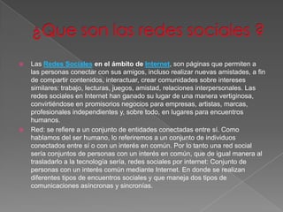 El documento habla sobre las redes sociales y los diferentes tipos que existen. Menciona que las redes sociales se han convertido en parte integral de la vida cotidiana y que incluyen plataformas como Facebook, Twitter, Instagram y muchas otras. También destaca tanto los beneficios de las redes sociales para conectar a las personas y compartir intereses, pero también advierte sobre los posibles peligros cuando no se usan de forma responsable y privada.