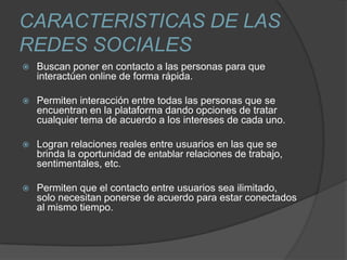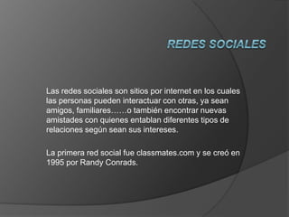 Las redes sociales permiten que las personas interactúen online con amigos, familiares y nuevas conexiones. La primera red social fue classmates.com en 1995. Actualmente, las cinco redes más populares son Facebook, Twitter, LinkedIn, YouTube y Google+. Twitter, lanzado en 2006, es un servicio de microblogging que permite enviar mensajes cortos de texto de hasta 140 caracteres llamados tweets.