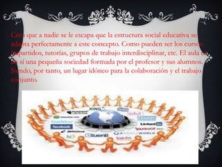 El documento analiza el papel de las redes sociales en el ámbito académico, destacando su capacidad para mejorar la comunicación entre alumnos y profesores y su naturaleza como estructuras sociales que fomentan la interacción. Se describen características clave de las redes sociales, como la hiperconectividad y la construcción de identidad, así como la popularidad de plataformas específicas como Badoo, Facebook y Twitter. También se menciona cómo estas herramientas han evolucionado y se han adaptado a las necesidades de conexión social y búsqueda de pareja o amistad.