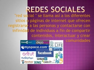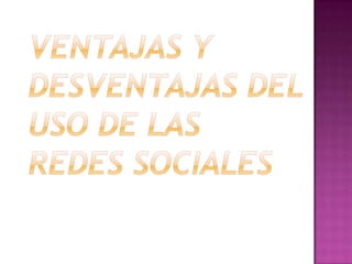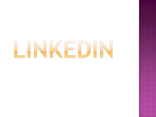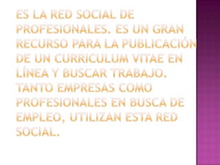 Este documento describe las redes sociales, incluyendo sus ventajas como la capacidad de compartir información y construir comunidades, y sus desventajas como problemas de privacidad y adicción. Luego, se enfoca en LinkedIn, la red social profesional líder con más de 100 millones de usuarios que permite a los usuarios conectarse con colegas y expertos para impulsar sus carreras. Finalmente, enumera las principales redes sociales actuales, con Facebook en primer lugar y LinkedIn en tercer lugar.