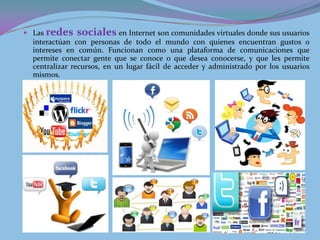 Las redes sociales son comunidades virtuales donde las personas interactúan con otras que comparten intereses. Se originaron en 1995 para mantener contacto con antiguos compañeros de estudio y evolucionaron para incluir servicios como listas de amigos, grupos, publicaciones y fotos. Si bien facilitan la comunicación y colaboración, también plantean riesgos como la invasión de la privacidad y posibilidades de adicción o comportamientos inadecuados.