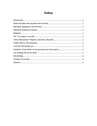El documento analiza la importancia de las redes sociales en la sociedad actual, destacando sus ventajas y desventajas. Se mencionan varias plataformas populares como Facebook, Twitter, y YouTube, y se discute su impacto en la comunicación y la interacción social. Además, se exponen los beneficios para la socialización, el trabajo y el negocio, así como riesgos como la exposición de la vida privada y la suplantación de identidad.