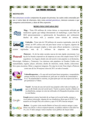 Este documento describe varias redes sociales populares divididas en diferentes categorías. Menciona que las redes sociales más visitadas en 2012 incluyen Facebook, YouTube, Twitter y LinkedIn. También describe redes para compartir fotografías como Flickr y Fotki, redes de negocios como LinkedIn y Viadeo, redes para adolescentes y jóvenes adultos como Tuenti y Facebook, y redes relacionadas con blogs como WordPress y Tumblr. En resumen, provee una descripción general de diferentes tipos de redes sociales populares.