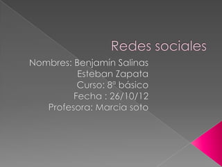 Este documento resume varias redes sociales como Twitter, Facebook, MySpace, Orkut, Hi5 y Skype. Explica brevemente sus características, como los mensajes cortos de Twitter, las fotos y estados en Facebook, y la caída de usuarios de MySpace. También menciona que estas plataformas fueron creadas entre 2003 y 2005 por diferentes empresas e individuos para conectar personas.