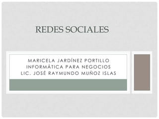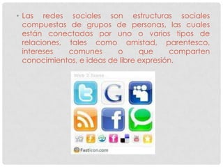 Las redes sociales son estructuras compuestas de grupos de personas conectadas a través de relaciones como amistad o intereses comunes. Se originaron en 1995 con el sitio classmates.com y crecieron en popularidad en la década de 2000 con la llegada de MySpace y otros. Permiten compartir momentos, conectar a personas a pesar de la distancia y acceder a información e eventos, aunque también plantean riesgos como la exposición de datos privados si no se configura la privacidad correctamente.