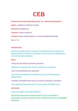 El documento resume las redes sociales y su importancia. Explica que las redes sociales como Facebook sirven para comunicarse con amigos y familiares lejanos, y menciona 5 razones por las que se usa Facebook. También destaca que las TIC (tecnologías de la información y comunicación) son importantes para el aprendizaje y la educación a distancia, y menciona 5 TIC importantes como el teléfono móvil e internet.
