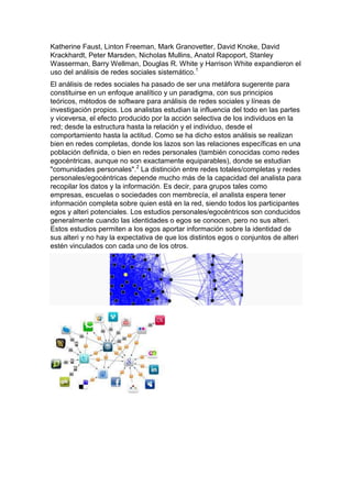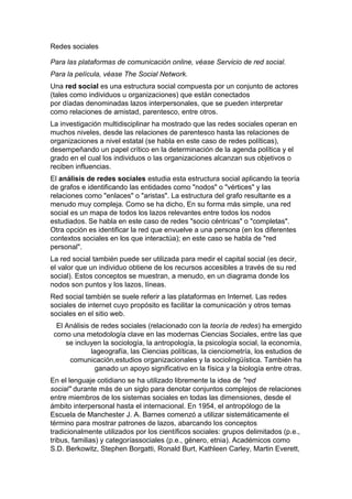 Una red social es una estructura social compuesta por individuos u organizaciones conectados a través de relaciones como amistad o parentesco. El análisis de redes sociales estudia esta estructura aplicando teoría de grafos para identificar nodos (entidades) y enlaces (relaciones). Las redes sociales operan a diferentes niveles desde relaciones familiares hasta políticas y juegan un papel crítico en determinar agendas y lograr objetivos.