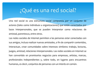 Las redes sociales permiten a las personas conectarse con amigos y hacer nuevas amistades compartiendo contenido e interactuando. Las más populares son Facebook, Twitter e Instagram. Facebook permite a los usuarios agregar amigos y publicar en su muro y álbum de fotos. Twitter permite publicar mensajes cortos de hasta 140 caracteres. Instagram se enfoca en compartir fotos a las que se les pueden aplicar filtros y efectos.
