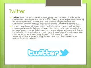 Las redes sociales permiten a los usuarios conectarse entre sí a través de perfiles y compartir contenido como fotos, videos y mensajes. Algunas de las principales redes sociales son Twitter (microblogging), Instagram (compartir fotos), YouTube (videos), SlideShare (presentaciones), Dropbox (almacenamiento en la nube), Waze (mapa colaborativo), LINE (mensajería) y Hotmail (correo electrónico).