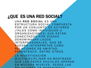 Este documento presenta una breve introducción a las redes sociales Facebook, Twitter e Instagram. Define qué es una red social y describe algunas de las principales ventajas y desventajas de cada plataforma, incluyendo la capacidad de mantenerse en contacto con otros, la falta de privacidad, la adicción y los perfiles falsos en Facebook, la brevedad requerida y el idioma predeterminado en Twitter, y la capacidad de compartir fotos con filtros y marcos en Instagram.