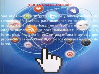 Este documento describe diferentes tipos de redes sociales, incluyendo redes sociales generales para contactos personales como Facebook y Twitter, redes profesionales como LinkedIn para conectarse con otros profesionales, redes de geolocalización para compartir ubicaciones, y redes especializadas según intereses como YouTube para video y Flickr para fotografía. También proporciona detalles sobre la historia, uso y beneficios de LinkedIn, la cual fue fundada en 2002 y ahora tiene más de 200 millones de usuarios profesionales de todo el mundo.