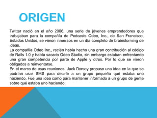 Twitter se creó en 2006 cuando los empleados de Odeo Inc. tuvieron un día de lluvia de ideas. Jack Dorsey propuso la idea de usar SMS para informar a un pequeño grupo de personas sobre lo que estaba haciendo. Twitter es ahora un servicio gratuito de microblogging que permite a los usuarios enviar tweets de hasta 140 caracteres que son compartidos con otros usuarios.