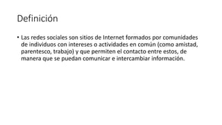 Las redes sociales son sitios de Internet que permiten a las personas con intereses comunes conectarse e intercambiar información. Ofrecen ventajas como mantenerse en contacto con conocidos, encontrar nuevos amigos o pareja, y compartir información sobre temas de interés sin importar la distancia geográfica, pero también tienen desventajas como exponer la privacidad de las personas y ser adictivas al consumir mucho tiempo. Las redes sociales más populares son Facebook, YouTube, Google+, Instagram, Twitter y Snapchat.