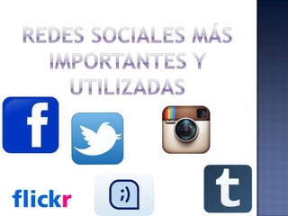Una red social es una estructura social compuesta por individuos u organizaciones conectados a través de relaciones como amistad o parentesco. El documento analiza diversas redes sociales como Facebook, Twitter, Tuenti, Instagram, Tumblr y Flickr, describiendo sus características y fundadores.