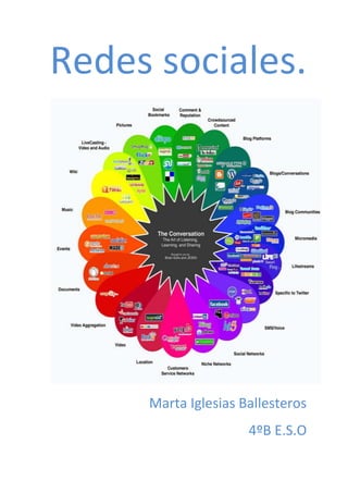 Este documento define las redes sociales y describe sus características, tipos, orígenes y ejemplos. Explica que las redes sociales permiten conectar e interconectar personas a través de plataformas electrónicas. Se clasifican en horizontales como Facebook y Twitter, y verticales como LinkedIn. Surgen en 1997 con SixDegrees y se popularizan en la década de 2000 con el crecimiento de sitios como Facebook y Twitter. Presentan ventajas como mantener contactos y desventajas como posibles riesgos a la privacidad.