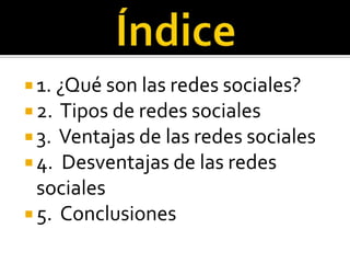 Este documento resume las características principales de las redes sociales Tuenti, Twitter y Facebook. Explica que Tuenti permite compartir fotos, chatear y hacer videollamadas, mientras que Twitter permite seguir a otros sin necesidad de aprobación y ver sus publicaciones. Facebook permite encontrar personas del pasado y compartir contenido multimedia. También destaca las ventajas de las redes sociales para la socialización, el trabajo y los negocios, así como sus principales desventajas como la exposición de la privacidad y la adicción.