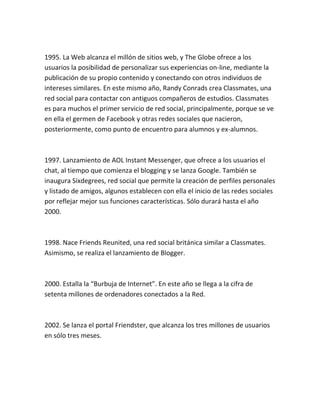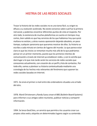 Este documento resume la historia de las redes sociales desde sus inicios en la década de 1970 hasta la actualidad. Comenzó con servicios de mensajería como BBS y AOL Instant Messenger, y luego sitios web tempranos como Classmates y SixDegrees que permitieron a los usuarios crear perfiles y conectarse. En la década de 2000, plataformas como Friendster, MySpace, LinkedIn, y Facebook se hicieron populares. Hoy en día, Facebook y Twitter tienen miles de millones de usuarios cada una. Las redes sociales continúan evolucionando y surgi