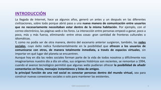 El documento explora la evolución y la importancia de las redes sociales en la comunicación moderna, resaltando su origen en 1994 y su capacidad para conectar personas a través de intereses comunes. Se clasifican las redes sociales en diferentes tipos según su propósito, como redes de entretenimiento, profesionales, de nicho y por contenido compartido, junto con ejemplos representativos. Además, se menciona una lista de las principales redes sociales en 2019 y sus características más relevantes.