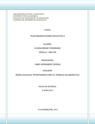 Este documento habla sobre el uso de redes sociales para el trabajo colaborativo. Explica que las redes sociales proveen las condiciones y recursos tecnológicos como computadoras e internet para que docentes y estudiantes puedan comunicarse, compartir información y procesarla de manera colaborativa mediante palabras, diálogos, videos y otros medios multimedia. También menciona que las redes sociales permiten incorporar diferentes disciplinas y realizar procesos de enseñanza-aprendizaje basados en enfoques constructivistas.