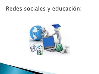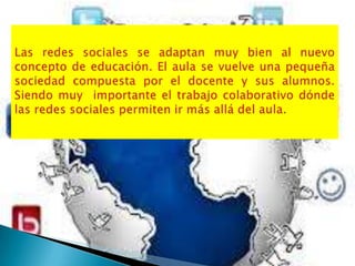 El documento describe los roles que juegan las redes sociales en diferentes ámbitos de la vida humana. Ofrecen una plataforma versátil para la comunicación interpersonal pública y privada de manera sincrónica y asincrónica. Esto fomenta el establecimiento de relaciones personales y grupales, y favorece dinámicas colaborativas y cooperativas de estudio e investigación. También acentúan el sentido de pertenencia al grupo y la creación de comunidades de enseñanza y aprendizaje.