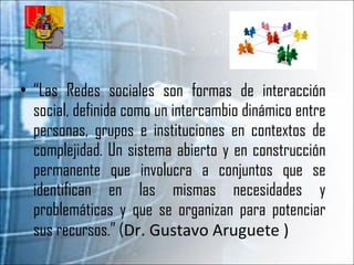 Las redes sociales son formas de interacción social definidas como intercambios dinámicos entre personas, grupos e instituciones. Alrededor de 2001-2002 surgieron los primeros sitios que fomentaban redes de amigos como Friendster, Tribe y Myspace. Facebook, creado por Mark Zuckerberg originalmente para estudiantes de Harvard, se convirtió en un negocio exitoso con millones de usuarios. Las redes sociales deben regularse para evitar malos usos y es responsabilidad de los usuarios mantenerlas apegadas a la realidad.