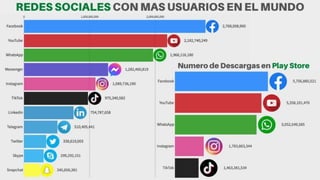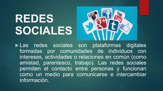 Las redes sociales son plataformas digitales que permiten la comunicación y el intercambio de información entre individuos con intereses comunes. Se utilizan para mantener contacto, informarse y entretenerse, y se clasifican en redes horizontales (como Facebook y Twitter) y verticales (como LinkedIn). Las más populares incluyen Facebook, YouTube, WhatsApp, Instagram, TikTok y Twitter, cada una con características y funciones distintas.