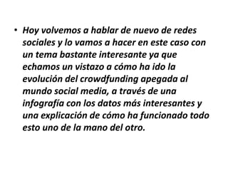 El documento describe la evolución conjunta del crowdfunding y las redes sociales. Explica que las redes sociales como Facebook y Twitter han influido en la evolución del crowdfunding permitiendo que las personas recauden fondos para proyectos a través de sus redes. También proporciona una breve historia del desarrollo de las redes sociales desde sitios pioneros como Classmates.com en 1995 hasta las principales plataformas como Facebook y Twitter de hoy.