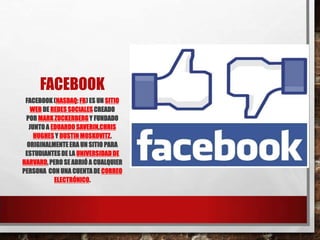 Facebook es un sitio de redes sociales creado por Mark Zuckerberg para estudiantes de Harvard que luego se abrió a cualquier persona con cuenta de correo. MySpace es un servicio de redes sociales propiedad de Specific Media y Justin Timberlake con sede en Beverly Hills. Twitter es un servicio de microblogging con sede en San Francisco y filiales en otros estados que fue creado por Jack Dorsey en 2006. Instagram es una aplicación para compartir fotos cuadradas con filtros y compartirlas en otras redes sociales.