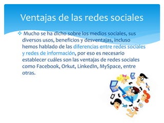 Las redes sociales permiten socializar con amigos, colegas y conexiones personales. Sin embargo, también tienen desventajas como la adicción que pueden causar, especialmente en adolescentes. Además, existen peligros como personas malintencionadas que pueden aprovecharse de la información privada que los usuarios comparten. Es importante tomar precauciones como no revelar detalles personales o fotos que puedan exponer información vulnerable.