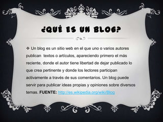 Este documento define qué es un blog y describe algunas redes sociales populares. Explica que un blog es un sitio web donde los autores publican artículos sobre temas de su interés y los lectores pueden comentar. También menciona algunos blogueros notables como Nir Ofer, Jessica Claire y Michelle Malkin. Resalta que las redes sociales permiten intercambiar información pero también requieren cuidar la privacidad de los datos personales.
