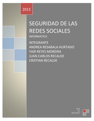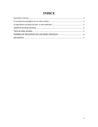 Este documento trata sobre la seguridad en las redes sociales. Explica 11 consejos para protegerse en las redes sociales como ser cuidadoso con los enlaces, no revelar información personal, y elegir las redes sociales con cuidado. También describe los conceptos básicos de las redes sociales y las normas de seguridad como usar contraseñas seguras y ser selectivo con los amigos. El documento concluye que la seguridad en las redes sociales es un desafío continuo debido a la cantidad de información personal que las personas comparten.