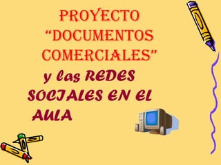 Este documento describe un proyecto para usar las redes sociales como entornos educativos en un taller de economía y administración. El proyecto utilizará Facebook para que los estudiantes compartan información sobre documentos comerciales. El objetivo es familiarizar a los estudiantes con las nuevas tecnologías, reconocer los peligros de Internet y fomentar un aprendizaje colaborativo.