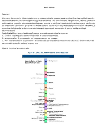 El documento describe las principales características y usos de las redes sociales como Facebook, Twitter, Hi5 y Sonico. Las redes sociales permiten a las personas construir perfiles, conectarse con otros y ver las conexiones de otros. Aunque Hi5 fue popular en el pasado, Facebook y Twitter ahora son las redes sociales más grandes, con cientos de millones de usuarios cada una. Sonico es una red social desarrollada en América Latina.