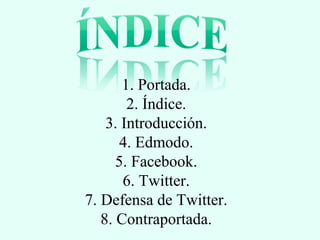 Este documento presenta una introducción a varias redes sociales educativas y profesionales como Edmodo, Facebook y Twitter. Discute las características y funcionalidades de cada plataforma, así como las ventajas y desventajas de Twitter. Concluye con una defensa de por qué los autores eligieron Twitter como su red social preferida.