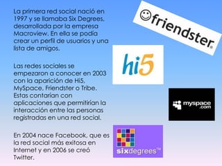 Las redes sociales son plataformas en Internet cuyo propósito es facilitar la comunicación y conexión entre personas permitiendo compartir información e interacciones. Permiten establecer contactos virtuales que eventualmente pueden convertirse en relaciones reales, y conectar a usuarios de forma ilimitada.
