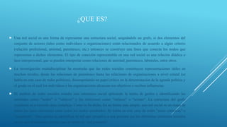 Una red social representa una estructura social mediante un gráfico de nodos y enlaces que conectan individuos u organizaciones relacionadas. El análisis de redes sociales estudia esta estructura aplicando teoría de grafos. Las redes sociales también se usan para medir capital social y facilitar comunicación en plataformas como Facebook, Twitter y YouTube.